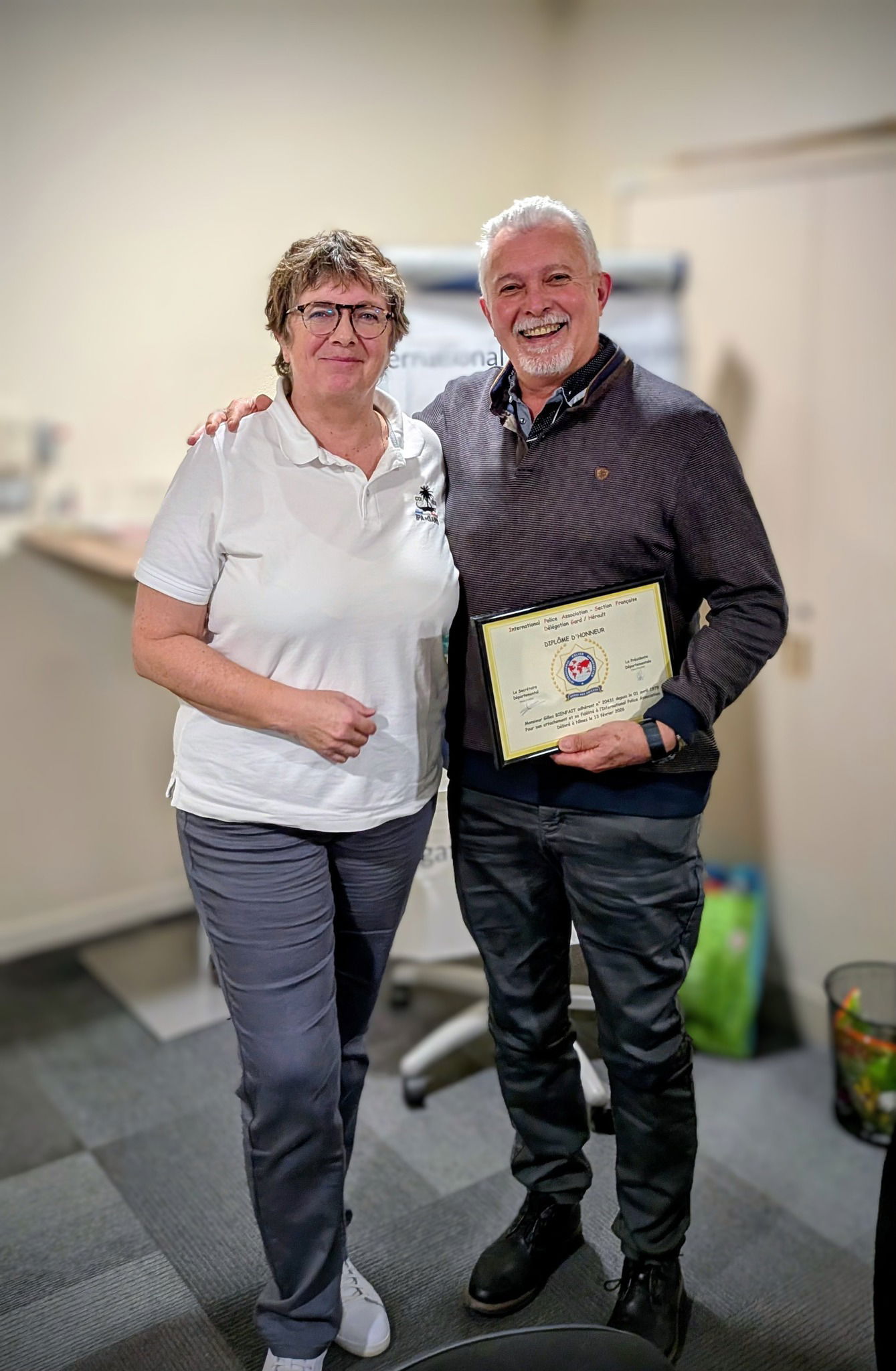 L’élection qui a suivi a vu l’ensemble des candidats élus. Avant la clôture de la réunion, notre adhérent Gilles B. a reçu des mains de la présidente un diplôme honorant sa fidélité et son engagement au sein de l’International Police Association depuis le 1er avril 1979.
